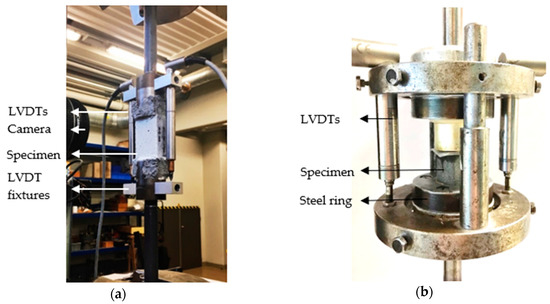 The specimens were first glued to steel adapters and subsequently clamped rigidly in the machine with the help of steel rods; see Figure 5a. The quasi-static uniaxial tension tests were performed in an Instron 8501 hydraulic testing machine under a controlled displacement rate of 0.05 mm/s. The deformations of the gauge portion were measured by two linear variable differential transducers (LVDTs) connected to the adapters on both sides of the specimens. Additionally, the deformations, formation of cracks, and fracture processes were monitored optically, and subsequently evaluated using digital image correlation (DIC). Images with a resolution of 3456 × 5184 pixels were taken with a Canon E05 700D camera at intervals of 5 seconds. The DIC evaluation was performed using the Aramis software by GOM GmbH.