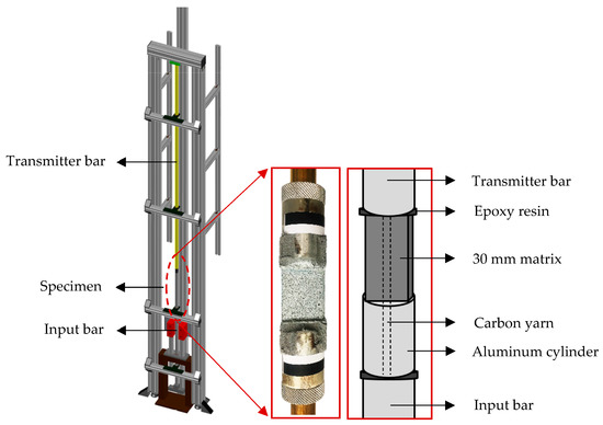 In the single-yarn pullout tests, the pullout force was calculated based on the measurements on the transmitter bar. The slip was calculated based on the relative displacement of the two bars according to one-dimensional wave analysis and optically with the help of DIC. An aluminum cylinder was used to connect the carbon yarn with the aluminum input bar to ensure identical impedance with the bar. In this way, the speed at the endpoint of the input bar could be regarded as the real pullout speed of the carbon yarn. SIRIUS® HS-STG+ systems produced by DEWEsoft® were used for data acquisition with a sampling rate of 1 million per second, and a filter of 40 kHz was adopted to reduce the electrical noise while avoiding possible phase shift in the signal.