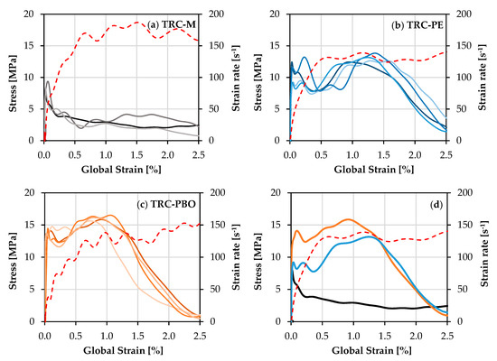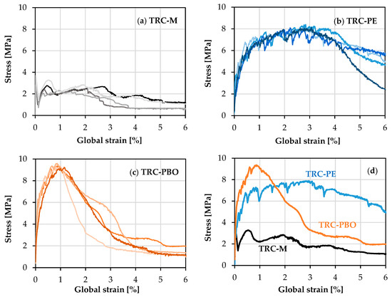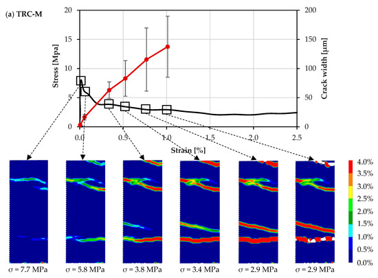 In the case of TRC-M without any discrete fiber reinforcement, the yarn failure and subsequent pullout are accompanied by the widening of the localization crack with no multiple cracking, yielding an average composite tensile strength of only 3.4 MPa, which is also the first crack stress; see Figure 7a. On the contrary, the materials reinforced additionally with short micro-fibers, i.e., the ones with SHCC matrix TRC-PE or TRC-PBO, exhibit strain-hardening behavior. The tensile stress increases after the first crack accompanied by the formation of multiple cracks; see Figure 7b,c.