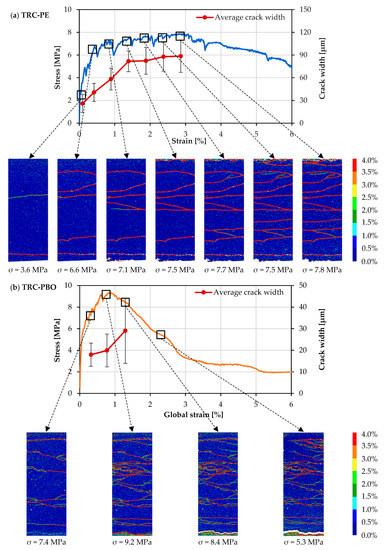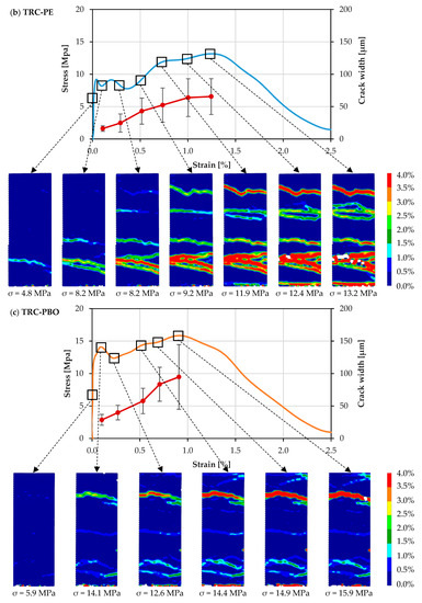 The ultimate strain capacity of the investigated composites is decided by both the average crack width and the average crack spacing, which is defined as the ratio of gauge length to the average number of cracks within the gauge length of the specimen. Figure 8 shows tensile stress–strain curves and corresponding average crack widths for representative specimens of TRC-PE and TRC-PBO. Due to the 5 second interval between individual image recordings, only a limited number of photos were taken during the tests. This explains the relatively low number of crack width measurement points in the case of TRC-PBO, as shown in Figure 8b.