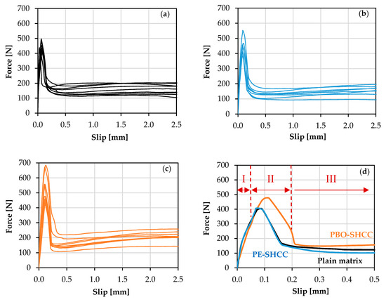 The force-slip curves of quasi-static single-yarn pullout from plain and SHCC matrices are plotted in Figure 9. The slip of the carbon yarns was recorded by LVDTs attached directly to the specimens. The force-slip curve can be divided into three stages, as shown in Figure 9d. According to the pullout load-slip model presented in [30,31], stage I corresponds to the linear elastic stage, and is followed by the gradual debonding stage II, which terminates at the end of the debonding process. Stage III represents the pullout process influenced mainly by the yarn–matrix interfacial friction.