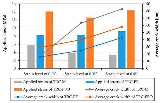 The stresses applied and the average crack width growth at the critical strain levels are plotted in Figure 12. Taking into consideration both the load-carrying capacity and the average crack width developed, TRC-PBO exhibits the highest stress levels and a favorable crack control behavior at each strain level. When comparing to TRC-M, a sudden loss in composite stiffness is avoided, which means that TRC-PBO is able to carry a higher impact load with a more steady development of cracks.