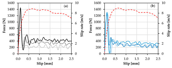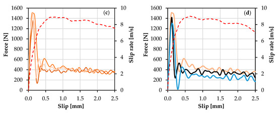 Dynamic force-slip relationships of single carbon yarns pulled out from: (a) plain matrix; (b) PE-SHCC; (c) PBO-SHCC; and (d) representative force-slip relationships for different composites up to a slip extent of 2.5 mm (the global strain rate curves are represented by dashed lines).