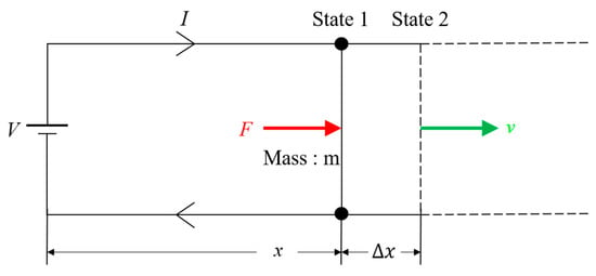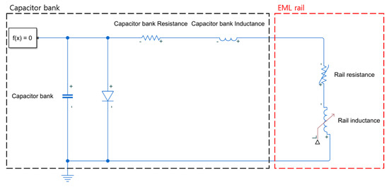 To identify the propulsion Lorentz force at a time instant, current () should then be determined. To acquire current () at a time instant, the series resistor, inductor, and capacitor (RLC) equivalent circuit of an EML was developed, as shown in Figure 2, following the initial conditions of the capacitor bank and EML. The original step response of the series RLC circuit is given by the following equation.
