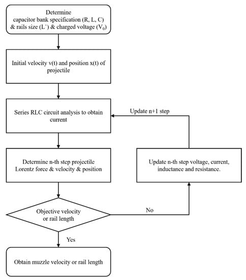 According to this equation, the performance of the EML can be predicted using the flow chart shown in Figure 3. By incorporating resistance and inductance gradients, system resistance and inductance were updated in this study to precisely predict the performance of a projectile.