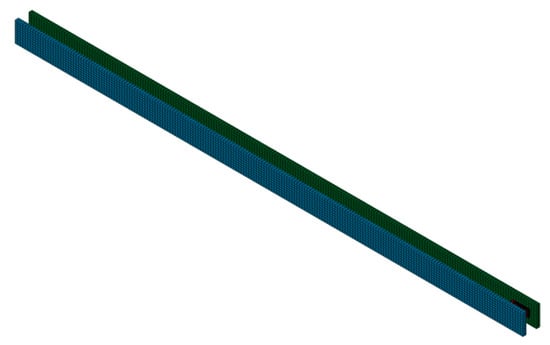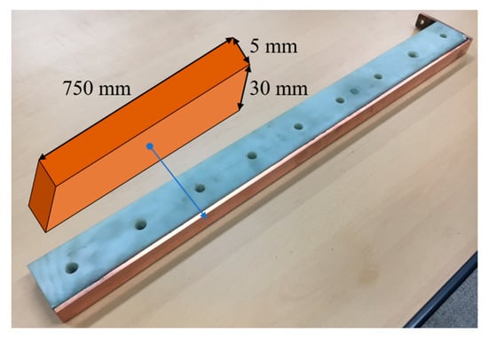 To analytically predict the performance of the EML, the capacitor and bank specifications are determined. Further, the length and size of rails are determined, as listed in Table 1. Each capacitor specification is 480 V and 6800 µF. One hundred capacitors are connected in parallel, and the equivalent specification of the capacitor bank is 480 V and 0.68 F; the rail size is 750 mm (l) × 30 mm (h) × 5 mm (w), as shown in Figure 4. These electrical properties of the capacitor bank and rails are listed in Table 2.