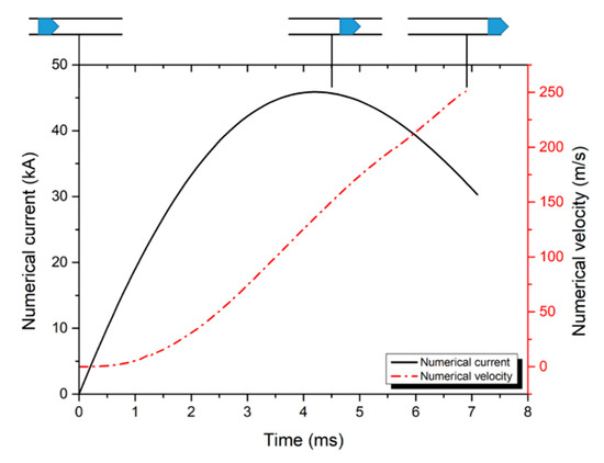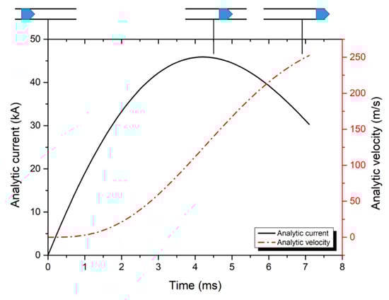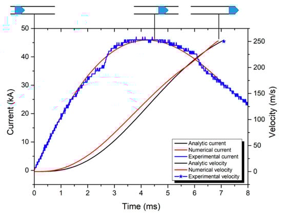 Current and projectile velocity profiles by analytical, numerical, and experimental methods.
