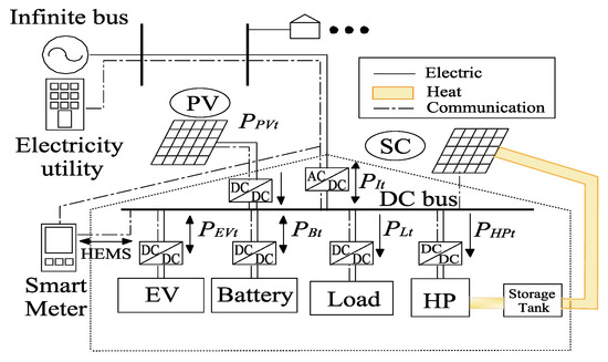 Smart home system model. EV, electric vehicle; HP, heat pump; PV, photovoltaic generation; SC, solar collector.