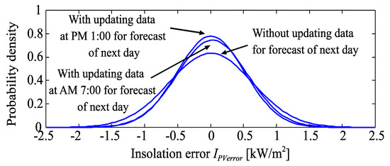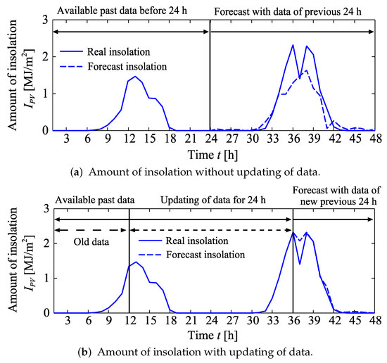 A NN is widely employed as one of the forecasted methods for insolation [31,32,33]. In this paper, an NN is used for the insolation forecasting method. Parameters entered into the NN toolbox in MATLAB® are depicted in Table 3. Input factors such as a data of atmospheric, temperature, humidity and hours of sunlight for the previous 24 h are entered into the NN. It can then forecast insolation for the proceeding 24 h. Furthermore, re-forecast and re-plan are conducted in the optimization for the scheduling of controllable loads. The data fed into the NN is updated every 3 h. The overview of re-forecast and updating data is shown in Figure 3. Learning (in which optimize synaptic weight is optimized) is carried out for 365 days. After learning of the NN, the weights are applied for another year in order to confirm the availability of the optimized synaptic weight. A probability density of the forecast error of insolation for the year is depicted in Figure 4. In addition to this, a probability density for the case of updating data is depicted in same figure. It is observed that the forecast error can be reduced by updating the data such as atmospheric and temperature which are used to forecast.