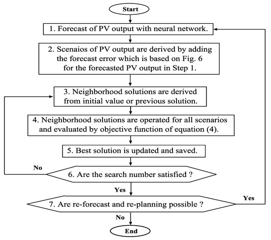 In this paper, a meta heuristic optimization technique is employed utilizing the TS [22,23] in order to achieve the optimal solution based on objective function (4) satisfying the constraints conditions (5)∼(10). The TS is widely employed for solving the optimization problem such as scheduling problems, with relatively shorter calculation time than the genetic algorithm (GA) [24,25,26]. In this work, the simultaneous re-forecast for PV output and plan controllable loads are executed every 3 h; the optimization problem can be effectively solved by the TS within a short period. Also, uncertainties of PV output are considered using a scenario-based approach which is widely employed for solving the scheduling problem and expansion planning problem of transmission network including uncertainties in power system [7,8,9,27,28]. The PV output can be expressed in several scenarios where each scenario is derived by adding the forecast error based on normal distribution into forecasted value in the optimization process. The solutions are operated for the possible scenarios and evaluate with expected value in the iterative step of TS optimization. Furthermore, the TS algorithm and optimization procedure are described in Section 3.3 and Section 3.4, respectively.