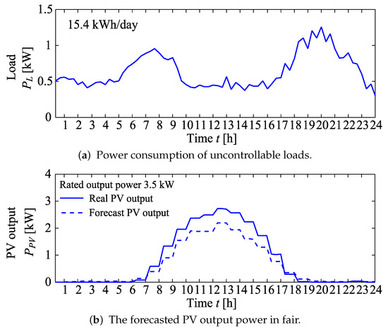 - It is supposed that power consumption and heat load in the smart home can be forecasted. The assumed power consumption of uncontrollable loads is shown in Figure 7a. NN is used for forecasting the insolation and the PV output which is calculated by Equation (2) from forecasted insolation, is depicted in Figure 7b where the forecasted error based on Figure 6 is added into the forecasted PV output.