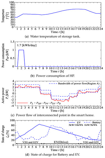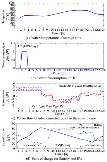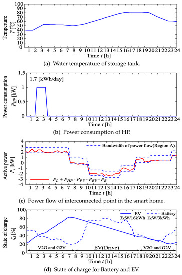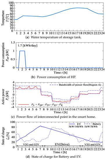 Next, the power flow of interconnected point in the smart home in case 1 is indicated in Figure 8c. It can be observed that the power flow deviates from bandwidth given by a power company due to the forecasted error in which re-forecast, re-plan and uncertainties are not considered. Furthermore, the state of charge for the battery and EV in case 1 is shown in Figure 8d, the charge/discharge power of the batteries is performed within the allowed constraints conditions.