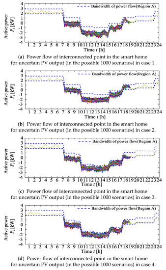 More discussion for the simulation results between case 1 and case 4, is as follows. if the real PV output would come out exactly as the forecasted one, the operational cost is minimized by operating the optimal scheduling of controllable load obtained by the optimization in even case 1. It means that the power flow as shown in Figure 8c exists in the low position of the bandwidth in Region A so that power consumption is minimized based on set the objective function. However, real PV output often deviates from the forecasted one. Thus, the controllable loads should be scheduled while considering the uncertainties in advance. That is the power flow shown in Figure 11c exists in the center within the bandwidth in the day time in preparation for the capability in which the forecast error would be relatively higher throughout the day.