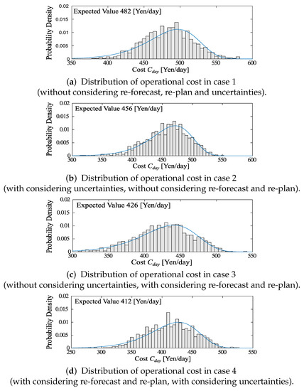 Figure 13 and Table 4 show distribution and histogram of the operational cost and the expected cost obtained by Monte Carlo simulation for 1000 scenarios which are derived by adding possible forecast error based on the normal distribution to the forecasted PV output. The verification results indicate that the expected value of operational cost for case 1 in which both re-forecast, re-plan and uncertainties are not considered, is the most expensive as depicted in Figure 13a (482 Yen/day). Furthermore, in case 2 which uncertainties are only considered, the cost is 456 [Yen/day] as depicted in Figure 13b. In case 3 which re-forecast and re-plan are only considered, the cost is 426 [Yen/day] as depicted in Figure 13c. The cheapest cost is depicted in case 4 which re-forecast, re-plan and uncertainties are considered as shown in Figure 13d (412 Yen/day).