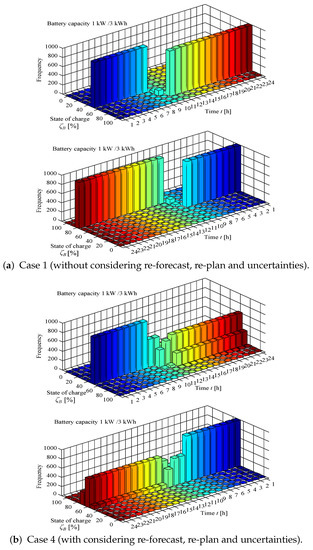 The frequency of the state of charge on the battery for 1000 scenarios in case 1 and case 4 are depicted in Figure 14a,b, respectively. The state of charge on the battery exists at almost 80% from 10:00 to 24:00 in case 1 which re-forecast, re-plan and uncertainties are not considered since the battery acts at the maximum of its capacity without consideration of the forecast error of PV output as shown in Figure 14a. On the other hand, in case 4 which re-forecast, re-plan and uncertainties are considered, the state of charge on that battery exists at almost 40∼60% from 10:00 to 24:00 in preparation for the forecast error of PV output as shown in Figure 14b. These results imply that the capacity of the battery may be even cut down by introducing the proposed method.