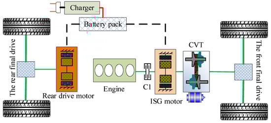 This study focuses on a plug-in 4WD HEV. Its structure layout is shown in Figure 1. Its powertrain is mainly composed of gasoline engine, an integrated starter and generator motor (ISG motor), rear-drive motor, CVT, one-way clutch C1, the front final drive and the rear final drive. The ISG motor mounted on the gearbox input (referred to as P2 []), and the rear-drive motor mounted on the rear driving axle (referred to as P4 []).
