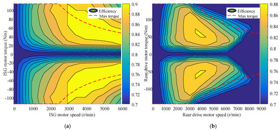 (a) The base integrated starter and generator (ISG) motor efficiency map and (b) the base rear-drive motor efficiency map.