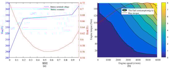 where and are the battery’s terminal voltage and the battery’s internal resistance, respectively. They are related to SOC and obtained by looking up tables according to SOC, as shown in Figure 3a is the nominal battery capacity and is the sample time.