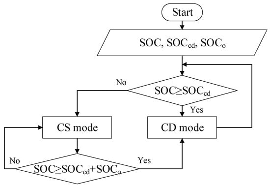 The energy management strategy based on the CD–CS mode for a plug-in 4WD HEV has two operating modes (CD mode and CS mode). When SOC ≥ SOCcd (SOCcd is the switch threshold between the CD mode and the CS mode) is satisfied, the vehicle operates in the CD mode. However, when the SOC drops to the lower limit, the vehicle runs in the CS mode to sustain the battery SOC. The CD and CS operating modes switching strategy is shown in Figure 4, where SOCo is the margin of switching back to the CD mode from the CS mode. In this paper, the value of SOCcd and SOCo were set to 0.3 and 0.05, respectively.