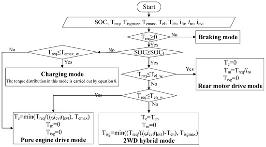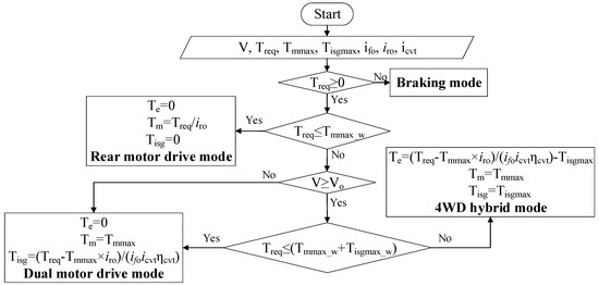 When SoC ≥ SOCcd, the vehicle operates in the CD mode, its corresponding control strategy flow is shown in Figure 5. V, Treq, Tmmax and Tisgmax are the vehicle’s speed, the demand torque at the wheel, the rear-drive motor’s maximum output torque and the ISG motor’s maximum output torque, respectively. ifo, iro and icvt are the speed ratio of the front final drive, the rear final drive and CVT, respectively. Their definitions are as follows: , and , , and are the same as Equation (4) and is the angular speed of the CVT output shaft. Tmmax_w is the equivalent wheel torque of rear-drive motor’s maximum output torque, it is expressed as Tmmax_w = Tmmax × iro. Tisgmax_w is the equivalent wheel torque of ISG motor’s maximum output torque, it is expressed as Tisgmax_w = Tisgmax × ifo × icvt × ηcvt. There are three drive modes (rear motor drive mode, dual motor drive mode and 4WD hybrid mode). In the rear motor drive mode, the vehicle is only driven by the rear-drive motor. In the dual motor drive mode, the vehicle is jointly driven by the rear-drive motor and the ISG motor. The rear-drive motor, the ISG motor and engine work jointly to meet the driving demand in the 4WD hybrid mode. If 0 ≤ Treq ≤ Tmmax_w is satisfied, the vehicle drives in the rear motor drive mode. When the vehicle runs at a low speed, and if Treq > Tmmax_w is satisfied, the vehicle drives in the dual motor drive mode. When the vehicle speed is higher than the predetermined speed Vo, and if Tmmax_w ≤ Treq ≤ (Tmmax_w + Tisgmax_w) is satisfied, the vehicle drives in the dual motor drive mode, otherwise the vehicle drives in the 4WD hybrid mode. Regenerative braking can be employed to recover energy in the braking mode, the braking strategy will be introduced in Section 3.3.