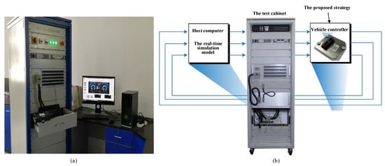 To verify the feasibility of the proposed strategy for plug-in 4WD HEV, a hardware-in-the-loop (HIL) test system was established, as shown in Figure 8a. A real-world vehicle controller was selected for the verification of the proposed strategy. The schematic diagrams of the HIL tests are shown in Figure 8b. It mainly includes three parts: The vehicle controller, test cabinet and host computer. The proposed strategy runs in the vehicle controller. The test cabinet integrates the power management module, fault injection module, signal conditioning module, signal acquisition and control module, system connection and conversion device, industrial computer, etc. It is mainly used to provide signal for the vehicle controller and process the output signal from the vehicle controller. The vehicle’s real-time simulation model and fuel and battery consumption were solved by the host computer.