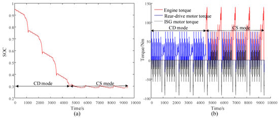 A CVT-based plug-in 4WD HEV was selected as the study object. The main parameters of this vehicle are shown in Table 1. Eight repeated NEDCs (new European driving cycles) were chosen for the simulation. The initial SOC and SOCcd were 0.95 and 0.3, respectively, and the allowable SOC range was 0.25–0.95.