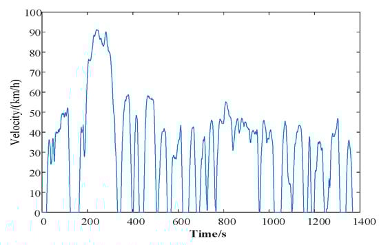 The powertrain’s dynamic model, energy management strategy and calculation model of the objective function were built by using MATLAB/Simulink simulation software, in which the driving cycles were selected under the urban road environment, as shown in Figure 11, the CD stage ran under one FUDS (federal urban driving schedule) driving cycle and the CS stage ran under three repetitive FUDS driving cycles. The parameters of the dynamic model were as follows: The wind resistance coefficient was 0.32 and the windward area was 2.28. The rolling resistance coefficient was 0.0135, the wheel radius was 0.307 and the conversion coefficient of rotary inertia was 1.02. The vehicle mass was calculated by: