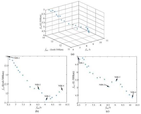 The optimal solutions. (a) The three-dimensional Pareto solution set; (b) the term Pareto front graph between the acceleration time and electric energy consumption and (c) the term Pareto front graph between the acceleration time and fuel economy.