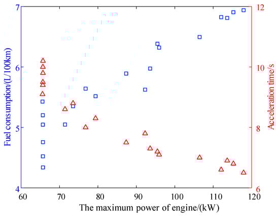 The term Pareto front graph between the acceleration time and fuel consumption is shown in Figure 12c. From the graph, the achievable extreme fuel consumption was obtained at non-dominated solution 4 (NDS-4, as shown in Figure 12), its value was 4.34 L/100 km. It can be seen that the 100 km fuel consumption was also in conflict with the acceleration time from 0–120 km/h. The maximum power of the engine played a major role. The effects of the engine’s maximum power on the fuel consumption and acceleration time are shown in Figure 13. The points in Figure 13 corresponded to the points in the term Pareto front in Figure 12. From Figure 13, fuel consumption increased with the increase of the maximum power of engine (the reason was that the load rate of the engine decreased with the increase of the maximum power of engine). However, the acceleration time decreased with the increase of engine maximum power.