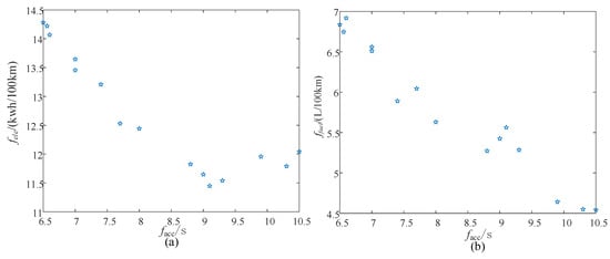 The Pareto optimal front using the weight approach. (a) The term Pareto front graph between the acceleration time and electric energy consumption and (b) the term Pareto front graph between the acceleration time and fuel economy.