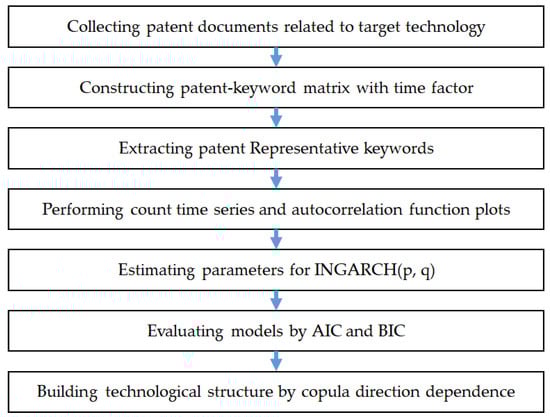 In Figure 1, each frequency value of the matrix is an integer. So we need a statistical approach to integer value analysis that considers the time factor. In this paper, we apply time series analysis and count data analysis to build the integer-valued analysis with time for patent data analysis. Integer-valued time series data are commonly observed in real data applications as well as technology analysis. Dealing with integer-valued time series using ARMA (autoregressive moving average) models and GARCH (generalized autoregressive conditional heteroscedastic) models which are used for real-valued data is not suitable for accommodating integer-valued time series in patent analysis. Integer-valued time series are non-negative and their variance often changes over time, which means that the assumption of homogeneous variance seems to be improper for such a time series. The integer-valued GARCH (INGARCH) model was proposed by Ferland et al. (2006) [20]. This model is used for integer-valued time series analysis. Also, the INGARCH model with Poisson deviates is an analogue of the GARCH model with normal deviates. Xt and Ft-1 are integer-valued time series data at time t and information set up to time t-1, and then the INGARCH(p,q) model is represented by a Poisson distribution as follows [20].