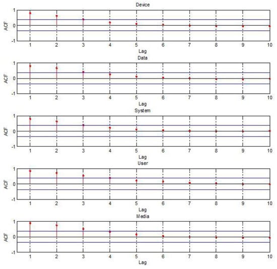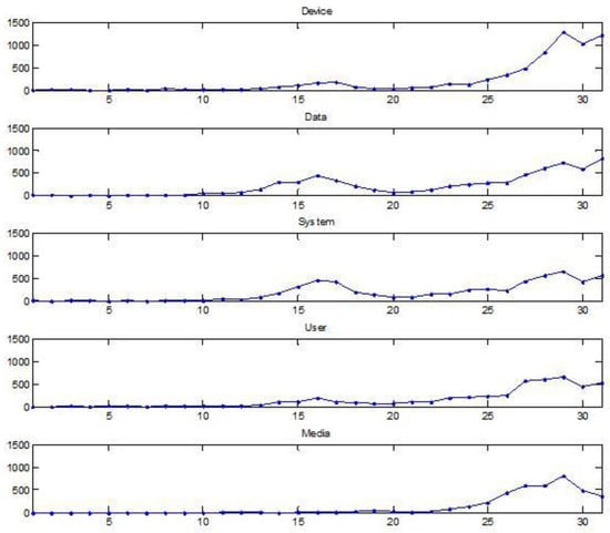 To verify the performance of our proposed method, we used the patent documents of Apple. Apple is a leading company in smart devices, and smart devices are dependent on diverse technologies. Apple’s patent data was used in many research studies for patent data analysis [6,17,26]. We have searched all patent documents applied and registered by Apple until 2012 from the patent databases [27,28]. The number of valid patents finally selected from the collected patent data was 8119. In this paper, we extracted technological keywords from the Apple’s valid patent documents using the text mining techniques [29]. The keyword data is a matrix consisting of a row of individual patent documents and a column of keywords. Each element of this matrix represents the occurred frequency value of the keyword in a patent document. Among them, we selected top five keywords with the highest frequency as follows; Device (6919), Data (6676), System (5936), User (4767), and Media (4157). The numbers in parentheses in the above keywords indicate the frequency of each keyword. These keywords were used to find the directional dependence by using Gaussian copula regression with beta logit [16]. First, we visually assessed the trend these five keywords showed over time. Figure 3 shows the time series plots of ‘Device’, ‘Data’, ‘System’, ‘User’, and ‘Media’.