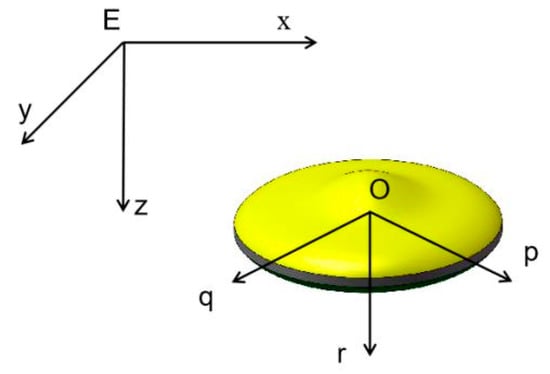 where is the resultant external moment vector relative to the origin of the moving coordinate system. is the Momentum moment of AUH relative to fixed coordinate system E-pqr. and are distance and velocity of AUH’s center of gravity relative to o-pqr, respectively. is the moment of inertia. In Equation (3), the first term represents the moment of inertia of rotating motion; the second term represents the moment of inertia of rotating unbalanced rotation of rotating axis; the latter is benign because the origin is not in the center of gravity; the third term is the moment of inertia of linear motion; and the fourth term is the moment of inertia of centrifugal motion.