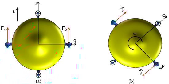 where is the rotary viscous drag coefficient. Since and are only related to fluid properties and shell material, they are of the same order of magnitude. When is the same as , is the same order of magnitude as . The AUH design translation speed is 0.8 m/s. Assuming that the AUH edge has a rotational linear velocity of 0.8 m/s, its angular velocity is about 90 deg/s, which is sufficient for high maneuverability. The thrust of the propeller selected according to the translational design speed is at least , and the minimum torque required to maintain the design rotational speed is much smaller than the torque that the propeller can provide. Therefore, can be ignored in the analysis.