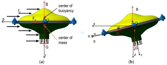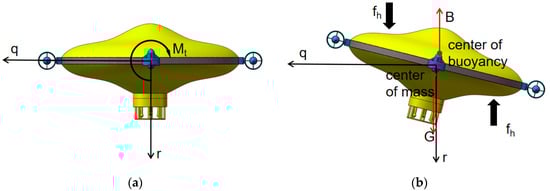 When AUH advances under the action of a horizontal propeller, the force acting on it is shown in Figure 4. Considering stability, AUH’s center of gravity is lower than the center of buoyancy. In addition, the special requirement of positioning and navigation system leads to the change of body shape. Both of them will cause horizontal thrust and fluid resistance to produce moments and that will cause the AUH to pitch. After pitching, due to the distance between the center of gravity and the center of buoyancy, the restoring moment will be generated, and the will change with the appearance of the angle of attack . The motion description of the pitch axis is shown in Equation (8).