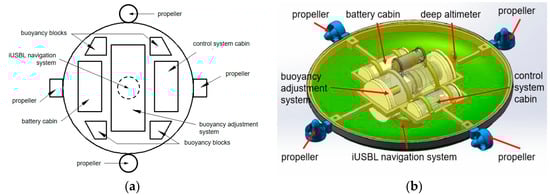 The AUH layout concept diagram and 3D model diagram are shown in Figure 6. It mainly includes two symmetrical cylindrical cabins, a battery cabin and a control system cabin, four propellers, iUSBL equipment for positioning and navigation, buoyancy material, a skeleton for connecting and supporting, and a disc-shaped hull. Each cabin passed the 100 m pressure seal test.