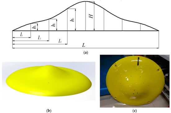 (a) Parameters of the disc-shaped hull; (b) 3D model of the hull; (c) photo of the disc-shaped hull.