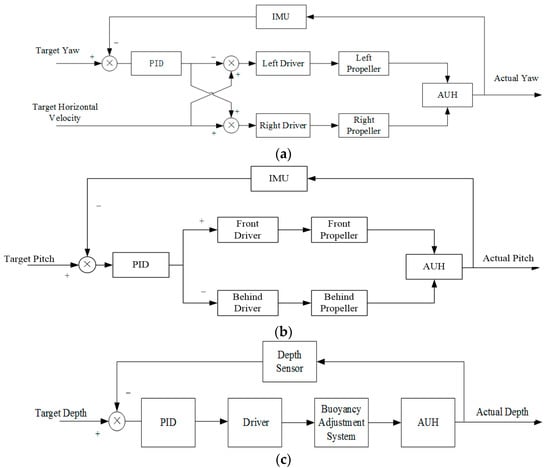 Control block diagram of (a) horizontal propellers; (b) vertical propellers; (c) buoyancy adjustment system.