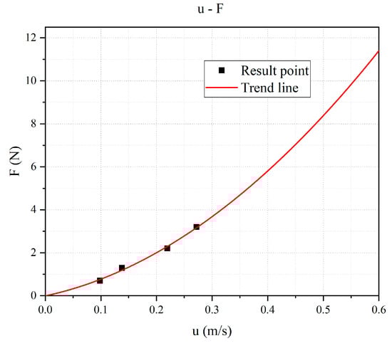 In the horizontal linear motion experiment, only a pair of horizontal propellers were used to make AUH move in the horizontal plane. The experiment was carried out in a pool that was 1.4 m deep and 50 m, with slight waves. The aim of this experiment is to determine the velocity and attitude of AUH under different thrust. In four sets of experiments, we set the control code of propellers’ output as 50, 100, 150, 200, respectively. The corresponding output force is 0.7 N, 1.3 N, 2.2 N, 3.2 N according to the performance of the propeller. The speed of each two recording points is calculated by the shore marking point timing, and the distance between every two recording points is 1 m. At the same time, a built-in nine-axis attitude sensor is used for attitude measurement and recording. The experimental results are shown in Table 2. According to the results, the trend diagram of thrust and AUH velocity is obtained as shown in Figure 10. The curve form basically accords with the relationship between resistance and speed, and it can be seen that the maximum thrust 38 N propeller is enough for AUH to reach the designed speed of 0.8 m/s. It is easy to see from the table that no matter what the thrust is, AUH can basically enter the target speed within 1 m and maintain a uniform motion, which indicates that AUH has high linear motion maneuverability.