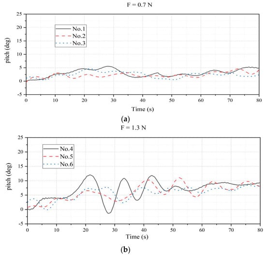 The horizontal motion attitude recorded by the attitude sensor is shown in Figure 11. When only the horizontal propellers were turned on, AUH appeared pitch vibration. In addition, with the increase of thrust, the frequency and amplitude of vibration also increased. Although the of F = 2.2 N and F = 3.2 N groups had finished running before they were stable, it could be seen from the F = 1.3 N group that the pitch oscillation was a damped vibration, and that it eventually maintained a fixed non-zero pitch angle. This is consistent with the theoretical analysis in Section 2, in which vertical propellers are important for maintaining high maneuverability.