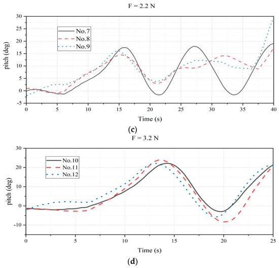 The pitch angle of horizontal motion experiments when F is (a) 0.7 N; (b) 1.3 N; (c) 2.2 N; (d) 3.2 N.