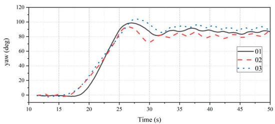 The purpose of the horizontal rotation experiment was to verify the zero radius rotation ability and explore the rotation response of the AUH, so as to demonstrate its maneuverability. The horizontal rotation experiment used the AUH to maintain a fixed heading direction. The AUH automatically rotated an angle and maintained it. The variation of the yaw angle during rotation was recorded by an attitude sensor. The step response is shown in Figure 13, and the average rotation speed is about 20 deg/s, almost four times as much as BOOMERANG. According to the observation, AUH had no obvious displacement when rotating. Therefore, we recognized that it does have the maneuverability of zero radius rotation.