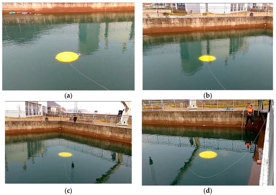The vertical lifting motion experiment was used to demonstrate the landing ability of AUH. As shown in Figure 16, the buoyancy adjusting device was used to adjust the buoyancy and complete the landing process. The AUH roll angle and pitch angle were recorded using the attitude sensor, and the results are shown in Figure 16e. Throughout the whole process, the AUH’s roll angle and pitch angle were very stable. Except for the impact caused by landing at about 400 s, they were both maintained near 0 degrees, with a maximum of 2 degrees. The overall landing process was stable, showing the stability of the AUH in the vertical direction.