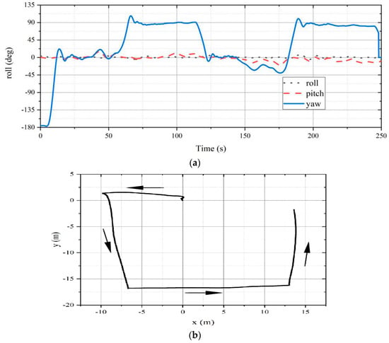 The quadrangle motion experiment in the horizontal plane. (a) The pitch, roll and yaw angle of AUH during the quadrangle motion experiment; (b) estimation of the trajectory of AUH.