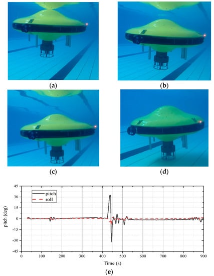 The vertical lifting motion and landing experiment. (a) AUH was near the surface of the water; (b) AUH began to sink; (c) AUH continued to sink; (d) AUH landed at the bottom of the pool; (e) the pitch angle and roll angle of AUH during the experiment.