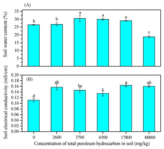 Soil properties play an important role in soil microorganism activity and plant growth. According to previous work, plants exposed to soils contaminated with petroleum hydrocarbons were subjected to growth limitations, due to low water uptake and reduced nutrient availability []. Mineral nutrient availability can be reflected by soil electrical conductivity. Therefore, soil water content and soil electrical conductivity need to be well understood in phytoremediation of soil contaminated with petroleum hydrocarbons. In this study, water contents increased in soil contaminated with certain TPH levels (3700–17,800 mg/kg) but decreased significantly when TPH levels reached 48,800 mg/kg. Water-stable aggregates in soil are related to the content of soil organic matter []. The addition of crude oil to soil increased the soil organic matter content, possibly resulting in enhanced water holding capacity at a certain limited range, as soil organic matter was an important determinant of the available water capacity []. However, the high concentration of crude oil in soil might prevent water from entering the pores of soil, which decreases water holding capacity.