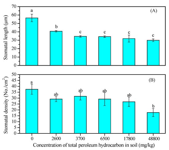 Plasticity of stomatal development may be determined by many exogenous and environmental cues, of which abscisic acid (ABA) is considered as a vital regulator of environmentally determined stomatal development []. According to previous work, ABA can increase progressively in the root with responses to abiotic environmental stress [,]. In particular, the level of endogenous ABA significantly increased in pea (Pisum sativum L.) plant with increasing fluoranthene concentrations []. Therefore, crude oil contaminated soil might stimulate the synthesis of ABA in maize root and then increase the amount of ABA, thus decreased stomatal length and density.