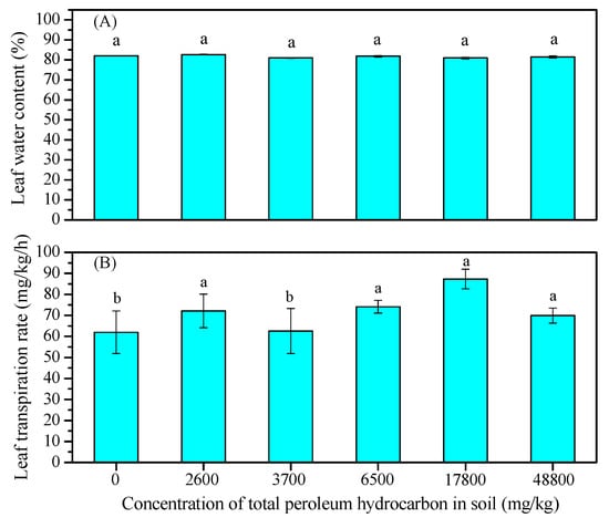 Effect of soil contamination with crude oil on water content (A) transpiration rate (B) of maize leaf (p < 0.05). Different letters on top of the bar indicate they are significantly different at p < 0.05.