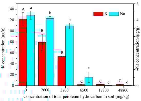 As the major mineral elements in plant tissues, K and Na play important roles in maintaining the physiological functions, especially in regulating the opening and closure of stomata. It is necessary to investigate the effect of crude oil contaminated soil on the K and Na assimilation of maize. As shown in Figure 4, both K and Na concentrations in maize leaf significantly decreased with increasing TPH levels of soils, indicating the crude oil contaminated soil had a significant effect on the assimilation of K and Na in maize plant. Additionally, K and Na concentrations in maize leaf at high levels of contaminated soil (above 6500 mg/kg) were much lower than those of the control.