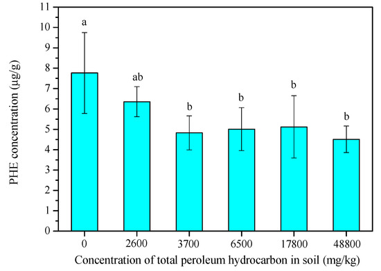 As shown in Figure 5, PHE concentrations of maize leaf in contaminated treatments were lower than that in the control group, and there were significant differences when TPH levels reached 3700 mg/kg. Furthermore, in the soil treatments with TPH levels ranging from 3700 to 48,800 mg/kg, PHE concentrations in maize did not exhibit significant changes.